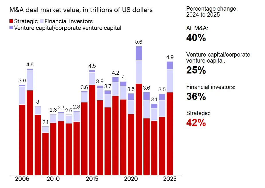- Global M&A surged 40% in 2025 to $4.9 trillion – the second-highest on record