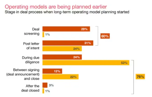 Integration is often cited as a key challenge area for acquirers. Research indicates that 60% of surveyed companies now plan long-term operating models before due diligence, up from 25% in 2019, directly wiring integration assumptions into valuation models and deal terms.
